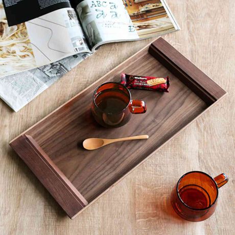 [型番:294302]【デザイン】●来客用にぴったりなトレーです。●カップとお菓子がのるぐらいのサイズ感です。●表面には、ノンスリップ加工がほどこれています。●持ち手付きです。【スペック】サイズ/約幅42×奥行21×高さ2cm内容量/1枚材質/ウォールナット(天然木)、積層材(ウレタン塗装)生産国/中国製食器洗い乾燥機/使用不可
