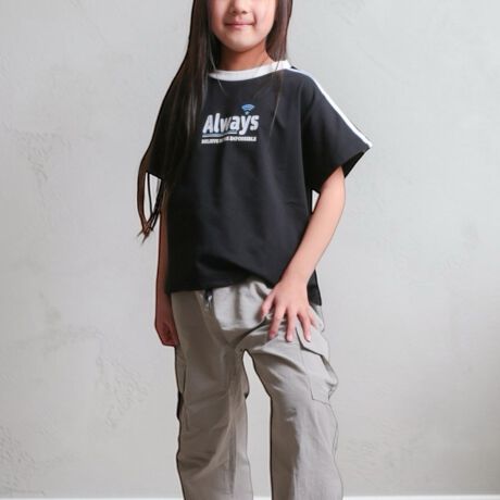 フロントとバックにロゴ、袖にラインテープを配したクルーネックTシャツ。