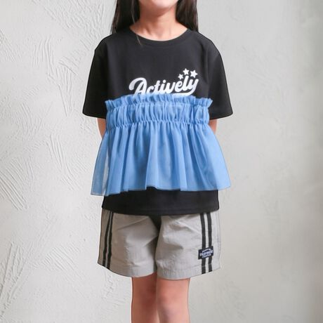 身頃下部にチュール素材をドッキングしたレイヤードデザインを採用しています。