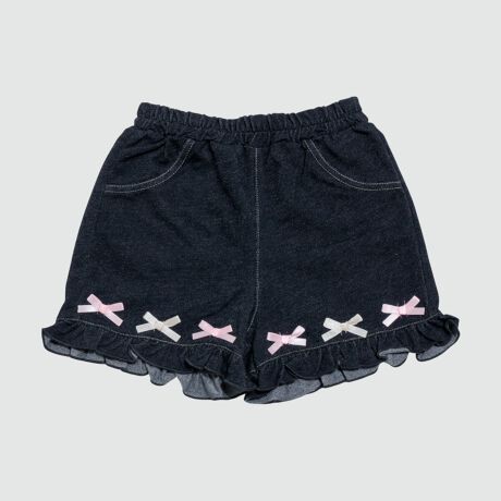 ニットデニム素材を使用したショートパンツ。ウエストは総ゴム仕様で着脱が容易な構造です。