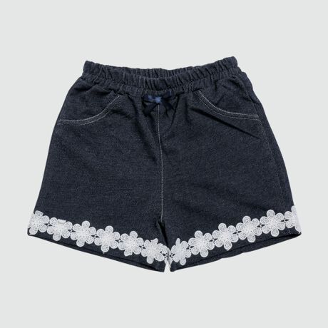 ニットデニム素材を使用したショートパンツ。ウエストは総ゴム仕様で着脱が容易な構造です。