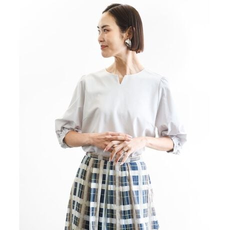 身頃はジャージー、袖は布帛で切り替えたデザインカットソー。いずれもコットン×ポリエステル素材を使用し、イージーケアを叶えます。ほどよいハリと軽やかさを活かし、袖口にゴムを入れたパフスリーブで立体感をプラス。衿元のキーネックがさりげないアクセントとなり、上品な印象に仕上げました。40サイズは限定店舗展開です。