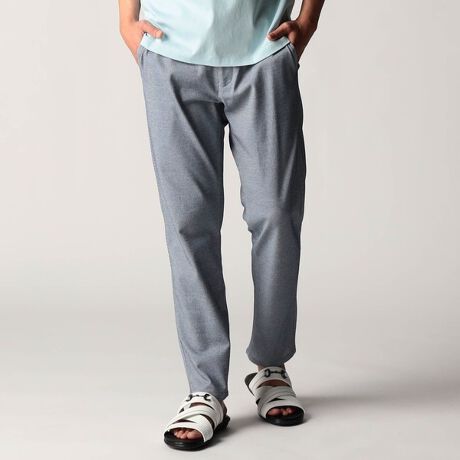 ウエストベルトには平ゴムを入れ、スピンドルを通していますのでサイズ調整をしやすくしたイージーパンツ仕様です。腰回りから太ももは程良い太さで、裾口にかけて細くテーパードしたシルエットのノータックパンツになります。生地がカットソー素材になりますので、少しゆとり感があります。股下は少し短い8分丈設定です。