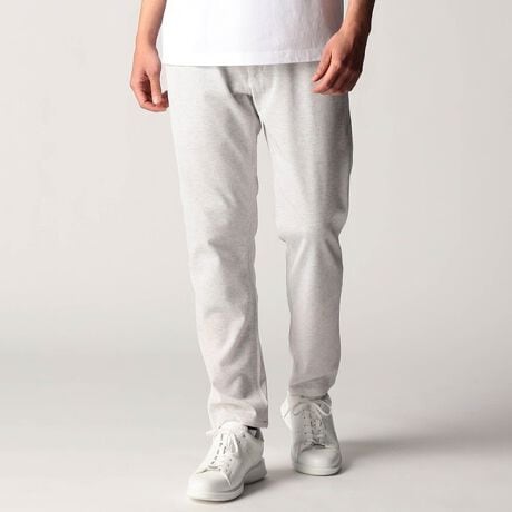 ウエストベルトには平ゴムを入れ、スピンドルを通していますのでサイズ調整をしやすくしたイージーパンツ仕様です。腰回りから太ももは程良い太さで、裾口にかけて細くテーパードしたシルエットのノータックパンツになります。生地がカットソー素材になりますので、少しゆとり感があります。股下は少し短い8分丈設定です。