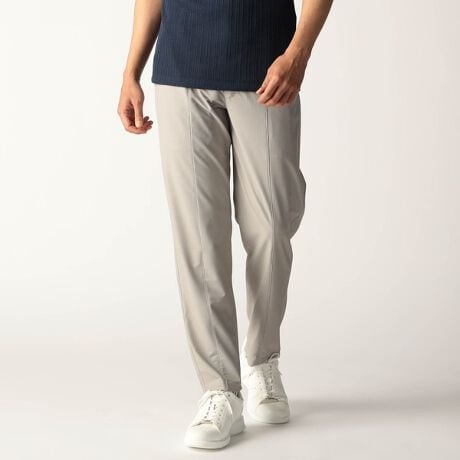 前身のセンター折山部分を接いで切り替えにしているイージーパンツ仕様のスラックスデザイン。裏側の別布はストレッチ裏地を使用して清涼感を出し、全体を軽く仕上げ、サラッとした肌触りと表地に追従する様に馴染みを良くしています。