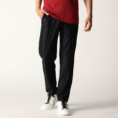 前身のセンター折山部分を接いで切り替えにしているイージーパンツ仕様のスラックスデザイン。裏側の別布はストレッチ裏地を使用して清涼感を出し、全体を軽く仕上げ、サラッとした肌触りと表地に追従する様に馴染みを良くしています。