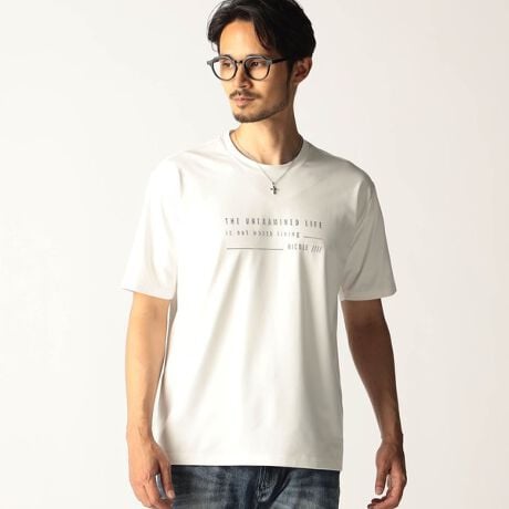 シャープな印象をあたえるメタルジェルプリントが目を惹くクルーネックTシャツになります。生地の光沢と立体的で光沢のあるメタルジェルプリントの相性は良く、高級感のあるTシャツに仕上がりました。
