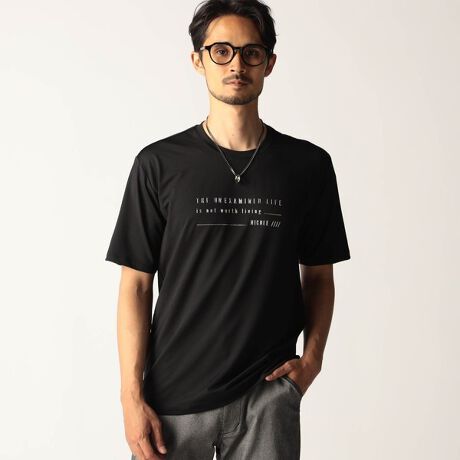 シャープな印象をあたえるメタルジェルプリントが目を惹くクルーネックTシャツになります。生地の光沢と立体的で光沢のあるメタルジェルプリントの相性は良く、高級感のあるTシャツに仕上がりました。
