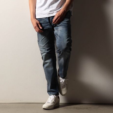 国内で最終加工、顔料を混ぜた樹脂コーティング剤を部分的吹き付け、所々アイロンでしっかり抑える事で縫い代の厚みがある部分や平たい部分に光沢を出してコーティングパンツの様な質感に仕上げます。最後に立体的でリアルな3Dシワ加工を施し、更に陰影感をつける様に顔料を吹き付けています。