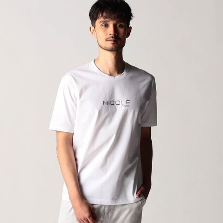 フロントに施したNICOLEロゴをメタルジェルプリントで表現し、モードな印象を高めました。デザインはシンプルなクルーネックタイプ。シャープなロゴがモード感を演出します。