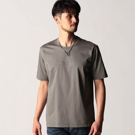 フロントに施したNICOLEロゴをメタルジェルプリントで表現し、モードな印象を高めました。デザインはシンプルなクルーネックタイプ。シャープなロゴがモード感を演出します。