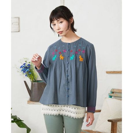 薄手のコットン100%素材に動物刺繍を施したブラウス。柔らかい軽やかな着心地で、季節の変わり目にオススメ。