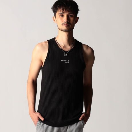 スモールロゴでアクセントを効かせたシンプルなタンクトップ。前下りを46サイズで12cm、48サイズで13cm、50サイズで14cmとクルーネック程の浅めに設定し、レイヤードしやすいデザインにしています。ランダムテレコは縦リブ組織ですっきりとした印象。ボーダー3色は黒スラブ糸を意識したランダムなストーム感が特徴です。