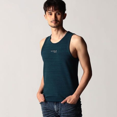 スモールロゴでアクセントを効かせたシンプルなタンクトップ。前下りを46サイズで12cm、48サイズで13cm、50サイズで14cmとクルーネック程の浅めに設定し、レイヤードしやすいデザインにしています。ランダムテレコは縦リブ組織ですっきりとした印象。ボーダー3色は黒スラブ糸を意識したランダムなストーム感が特徴です。