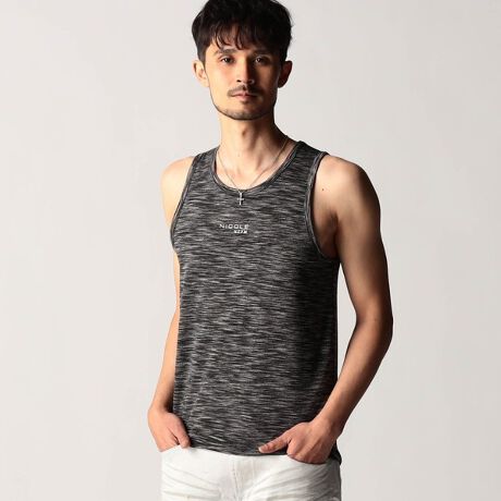 スモールロゴでアクセントを効かせたシンプルなタンクトップ。前下りを46サイズで12cm、48サイズで13cm、50サイズで14cmとクルーネック程の浅めに設定し、レイヤードしやすいデザインにしています。ランダムテレコは縦リブ組織ですっきりとした印象。ボーダー3色は黒スラブ糸を意識したランダムなストーム感が特徴です。