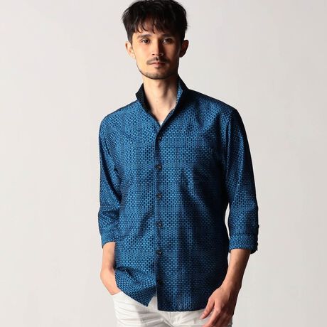 衿端にワイヤ−を仕込んだ七分袖のスタンド・イタリアンカラ−シャツ。カフス裏や裾裏には配色の別布を使いアクセントになる様にしています。生地の配色とリンクした釦も、ちょっとしたアクセントになっています。