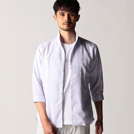 衿端にワイヤ−を仕込んだ七分袖のスタンド・イタリアンカラ−シャツ。カフス裏や裾裏には配色の別布を使いアクセントになる様にしています。生地の配色とリンクした釦も、ちょっとしたアクセントになっています。