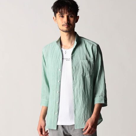 衿端にワイヤ−を仕込んだ七分袖のスタンド・イタリアンカラ−シャツ。今季は衿の高さを低くした新デザインになります。プリーツ素材の為、ボリュームがありますので、ヨーク裏やカフス裏には同色系のストレッチ裏地を採用する事で部分的な厚みを抑え、チラチラしたアクセントにしています。袖口も配色釦にして、ちょっとしたアクセントにしています。