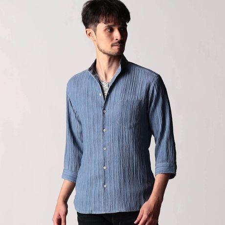 衿端にワイヤ−を仕込んだ七分袖のスタンド・イタリアンカラ−シャツ。今季は衿の高さを低くした新デザインになります。プリーツ素材の為、ボリュームがありますので、ヨーク裏やカフス裏には同色系のストレッチ裏地を採用する事で部分的な厚みを抑え、チラチラしたアクセントにしています。袖口も配色釦にして、ちょっとしたアクセントにしています。