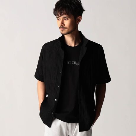 衿を立ててイタリアンカラーの様にも、寝かせてオープンカラーの様にも着用出来るようにしたスタンドオープンカラーの半袖デザインシャツ。衿端にワイヤ−を仕込み、アレンジが可能です。半袖ですがカフス仕様にして裏側に同色系裏地を使ってちょっとしたアクセントにしていますので、折り返したりして遊べます。程良く効いたストレッチ性とサラッとしたタッチはとても着やすい、シンプルな大人シャツです。