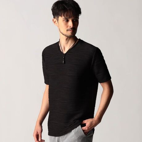 浅めVネックのシンプルなデザインで大人受けする上質なカットソーに仕上げました。独特なジャカード゙柄の表情豊かなテキスタイルデザインがスタイリングを魅力的に演出してくれる一着。インナーとしては勿論、1枚で着ても存在感抜群な仕上がりになっています。