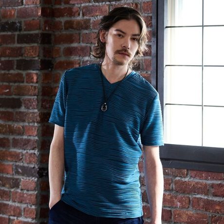浅めVネックのシンプルなデザインで大人受けする上質なカットソーに仕上げました。独特なジャカード゙柄の表情豊かなテキスタイルデザインがスタイリングを魅力的に演出してくれる一着。インナーとしては勿論、1枚で着ても存在感抜群な仕上がりになっています。