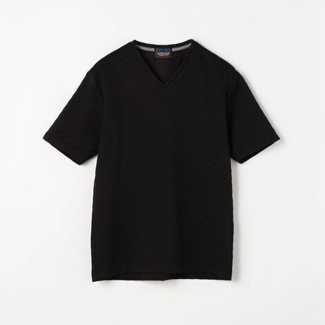 ブリスター(膨れ)編みにより凹凸感のあるバイヤス柄を表現し、シャープな印象を持たせたシンプルな浅VネックTシャツ。