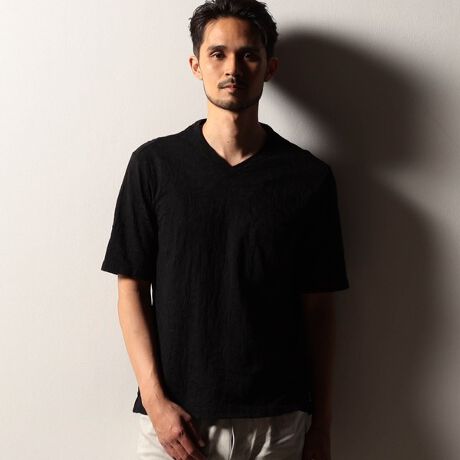 国産のボタニカル柄リンクスジャカード素材を使用したVネックカットソー。神奈川県川崎にある縫製工場で製造した日本製のプレミアムな一着です。吸水速乾機能を持ったナチュラルな素材感が夏場まで涼しげにご着用いただけます。前身のパッチポケットや衿ぐりの共生地テープ始末、脇のスリット仕様をポイントに、脇の縫い代には消臭抗菌テープを入れて機能性もプラスしたこだわりの仕上がりです。
