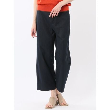 シンプルなデザインで合わせやすい、ワイドシルエットのテーパードパンツです。動きやすさを考慮した設計と脚長効果のあるシルエットがポイント。ウエストストレッチで着用ストレスを軽減しています。フロントボタン&ファスナー有り、ベルト通し付き、前シームポケット付き、後ろのポケットはフェイク仕様です。