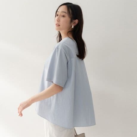 後ろ身頃は布帛素材をドッキングし、ふんわりと広がるバックシャンなフレアシルエットが動きのある表情をプラスします。