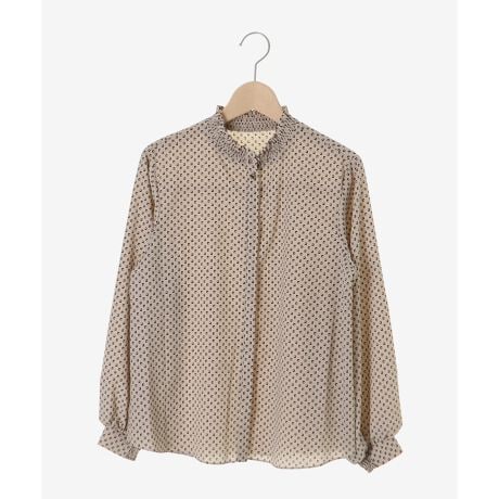 衿元のシャーリングとゴールドのボタンがアクセントの幾何柄ブラウス。