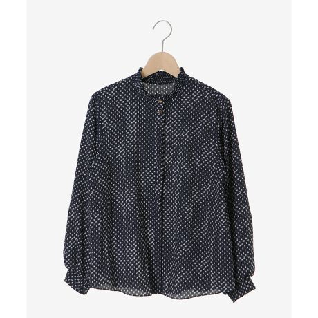 衿元のシャーリングとゴールドのボタンがアクセントの幾何柄ブラウス。