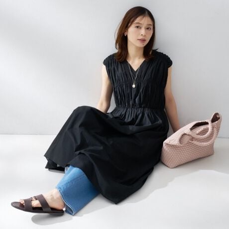 肩とバスト、そしてウエストにシャーリングが繊細に施されたロングワンピース。