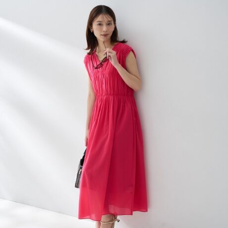 肩とバスト、そしてウエストにシャーリングが繊細に施されたロングワンピース。