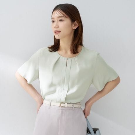 縦ラインディテールが印象的な、クリーンでミニマルなデザインのブラウス。