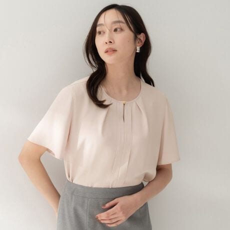 縦ラインディテールが印象的な、クリーンでミニマルなデザインのブラウス。