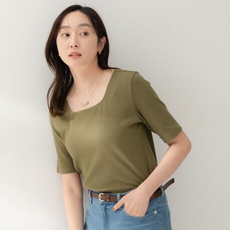 洗練された印象を持つスクエアネックと上品な五分袖が特徴的なトップス。