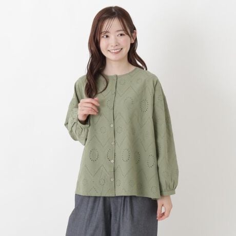 程よい薄さの60コットン布帛生地にアイレットの総刺繍を施したシャツ。