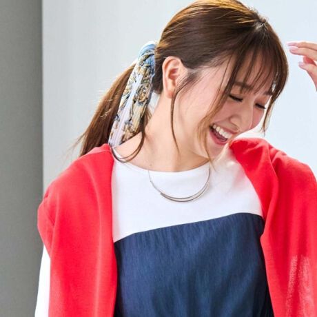 シンプルなニットやカットソーにさらっと一巻きするだけで、装いの華やかなアクセントに。