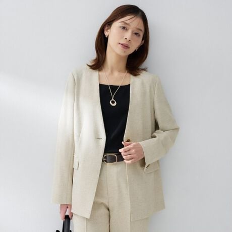 シンプルながら洗練された印象を与えるカラーレスジャケット。