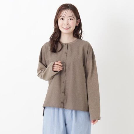 1枚でコーディネートが完成するアイテムです。前開きのボタン仕様で、羽織としてもトップスとしても着まわせます。