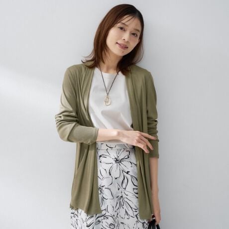 シワになりにくく接触冷感機能も併せ持った素材で、さらっと羽織れて冷房対策としても使っていただけるアイテムです。