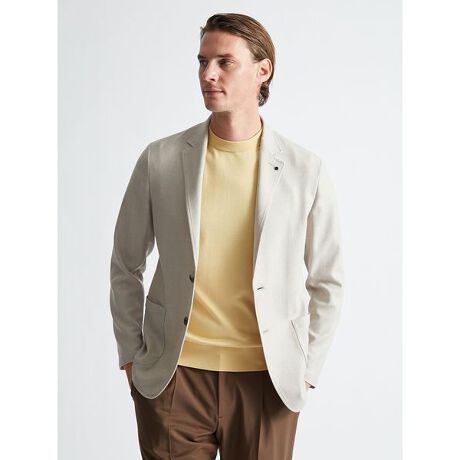 伸縮性がある素材なので、野暮ったくならないようにシャープな印象のシルエットに仕上げました。快適な着用感も兼ね備えた楽ちんジャケットになります。