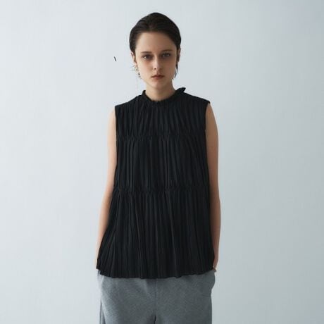 ・襟元から贅沢に施されたプリーツが、装いに華やかな立体感をプラス。