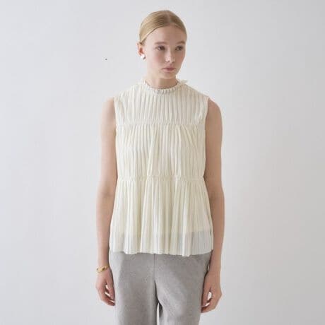 ・襟元から贅沢に施されたプリーツが、装いに華やかな立体感をプラス。