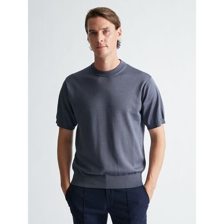 プレーティング編みという表裏の表情を変えることのできる編み方を用い、表側にはシルク、裏側には綿という構成で編み立てることで、シルクの高級感と綿の着心地をあわせもった仕上がりとなっています。