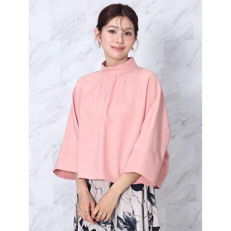 フロントはスタンドカラーに寄せた繊細なギャザーが首元を上品に彩り、顔まわりに華やかさをプラス。