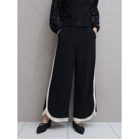 サイドラインから続くスリットデザインがブラックカラーながらに華やかさの纏うロングパンツ。フロントに施された縫い付けタックがさりげなくIラインを意識させスタイルアップ効果に。総ゴムタイプで安心感のある履き心地を実現。セットアップ合わせから幅広いコーディネートに寄り添います。