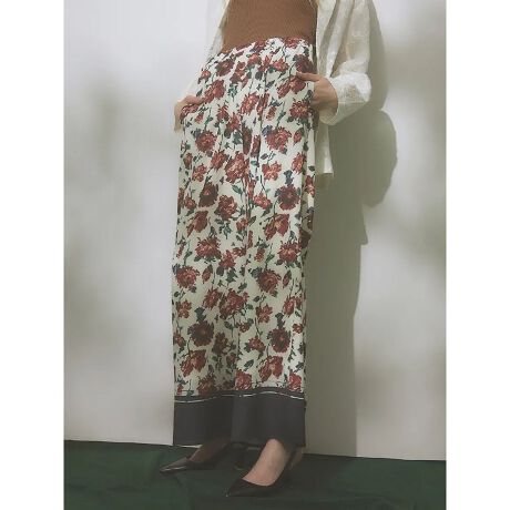 同素材のフラワートップスとのセットアップスタイルはもちろん、シンプルなカットソーやニットと合わせたカジュアルスタイルもおすすめ。