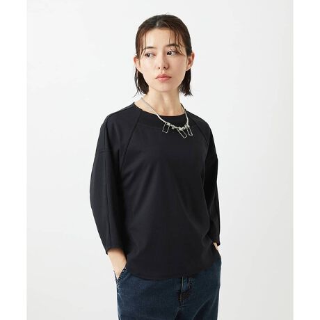 首元・後ろ裾のシアーの切替がアクセントになり、ほどよい透け感で軽やかな印象になります。肘まで隠れる6分袖なので気になる腕周りもカバーし、一枚で着用しても安心です。身頃は変形のドルマンスリーブでゆとりがあり、初夏でも涼しく着用いただけます。